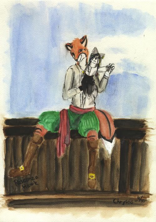 Hawk on sonnustautunut hyvin tummanvihreisiin pussihousuihin, jotka pysyvät paremmin paikallaan kalliin, verenpunaisen vyönä toimivan silkkihuivin avulla. Silkkihuivin solmu on takana. Rasconzan valkoisen paidan helmat ovat siististi housuissa, mutta muuten hän pitää paitaa kuin sillä ei olisi mitään väliä - kaulus repsottaa auki muutaman napin varassa ja ketun rintakehässä olevat pitkät kolme miekanviilloista peräisin olevaa arpea ovat varsin näkyvillä. Rasconzalla on kaulassaan, hopeisen ketjun varassa hänen ensimmäinen ryöstösaaliinsa - kauniinkultainen lohikäärmeen suomu, ei mikään isoin, kettu epäilee suomun olevan läheltä hännänpäätä tai aivan silmän vierestä.
